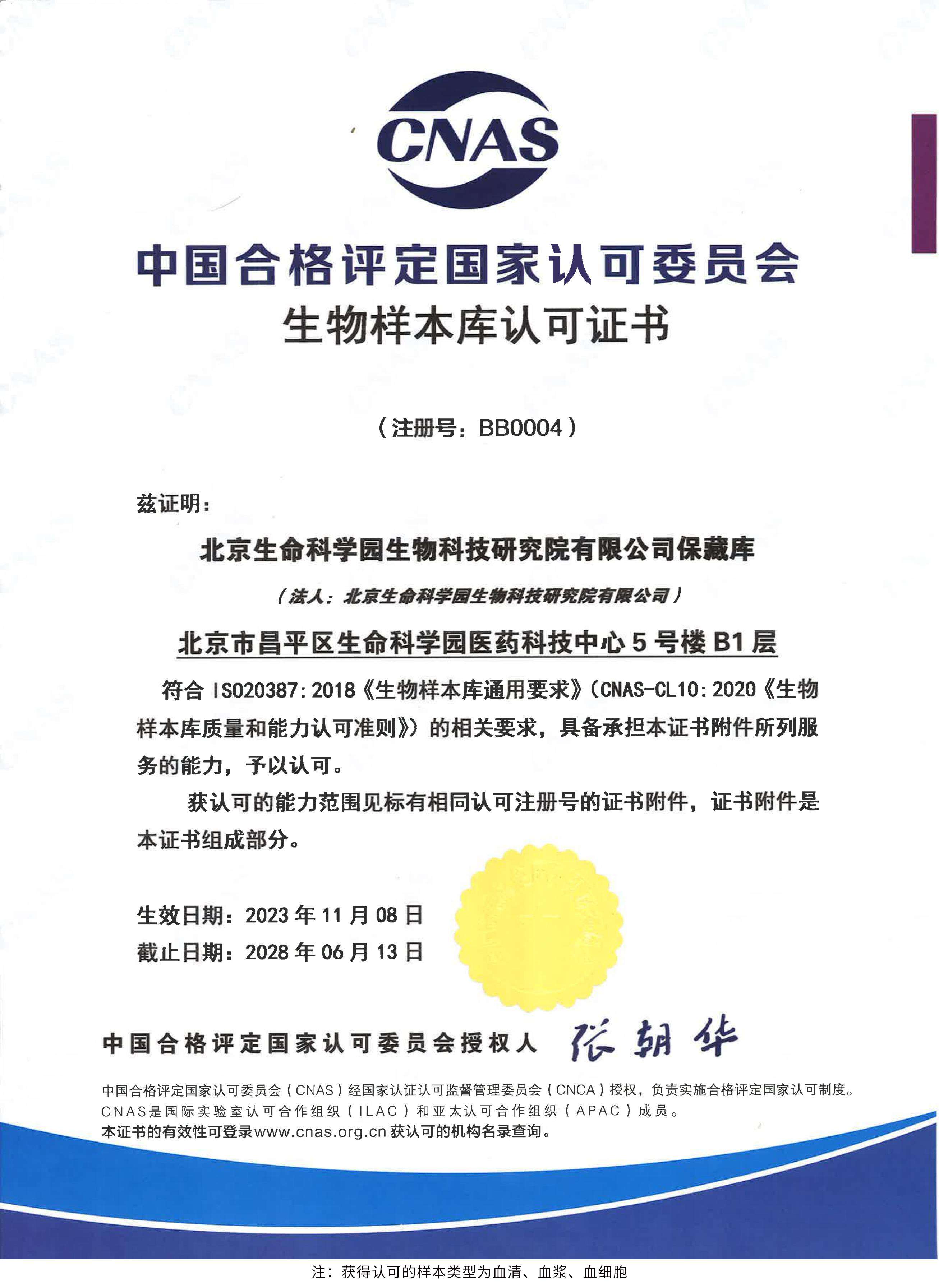 北京生命科學園生物科技研究院(以下簡稱“北京生物樣本資源庫”)(Biobank of Life Science Park,簡寫“BoLSP”)是一家由北京市科委和中關村生命科學園共同支持設立的第三方生物樣本庫公共服務平臺,秉承北京重大疾病臨床數(shù)據(jù)和樣本資源庫(以下簡稱“北京庫”)(Beijing Biobank of Clinical Resources,BBCR)十余年的發(fā)展成果,聚合眾多臨床樣本專家的專業(yè)共識,致力于在生命科學、生物醫(yī)藥研究領域發(fā)揮銜接樣本資源持有者與研究者的橋梁作用,解決生物樣本資源開發(fā)上下游信息不對稱、資源共享困難等問題。研究院在北京中關村生命科學園昌平園區(qū)建立了2000㎡生物樣本庫,最大存儲規(guī)模達1000萬份。研究院遵循CNAS-CL10:2020《生物樣本庫質量和能力認可準則》,同時結合北京庫過去十年的工作經驗與教訓,建立了一套完善的生物樣本保藏質量管理體系,從人、機、料、法、環(huán)、控多個角度,實現(xiàn)生物樣本保藏過程的全面質量控制,先后獲得國家科技部頒發(fā)的人類遺傳資源保藏行政許可證書和中國合格評定國家認可委員會(China National Accreditation Service for Conformity Assessment,CNAS)頒發(fā)的“CNAS認可證書”。